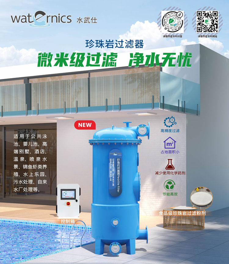 资料显示,在关键的循环过滤环节,广州千叶选用了AQUA爱克循环水泵与Waternics水武仕珍珠岩过滤器。前者搭载4极电机,1450rmp转速下运行噪音比普通水泵低 10dB以上,且同功率下流量翻倍,节能50%;后者以天然珍珠岩粉末为介质,实现1微米级高精度过滤(人类头发直径约60微米),对大肠杆菌、藻类等微生物去除率超99.5%,浊度低至0.1,出水指标远远高于国家标准。