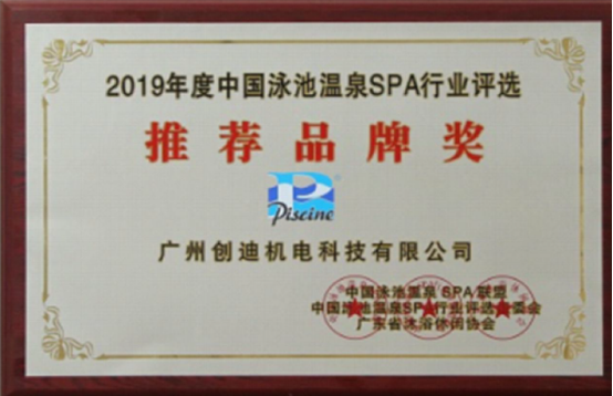 2019年,Piscine碧池凭借过硬的产品质量和周到热情的技术服务,荣获中国泳池温泉SPA水乐园行业年会的“推荐品牌奖“。