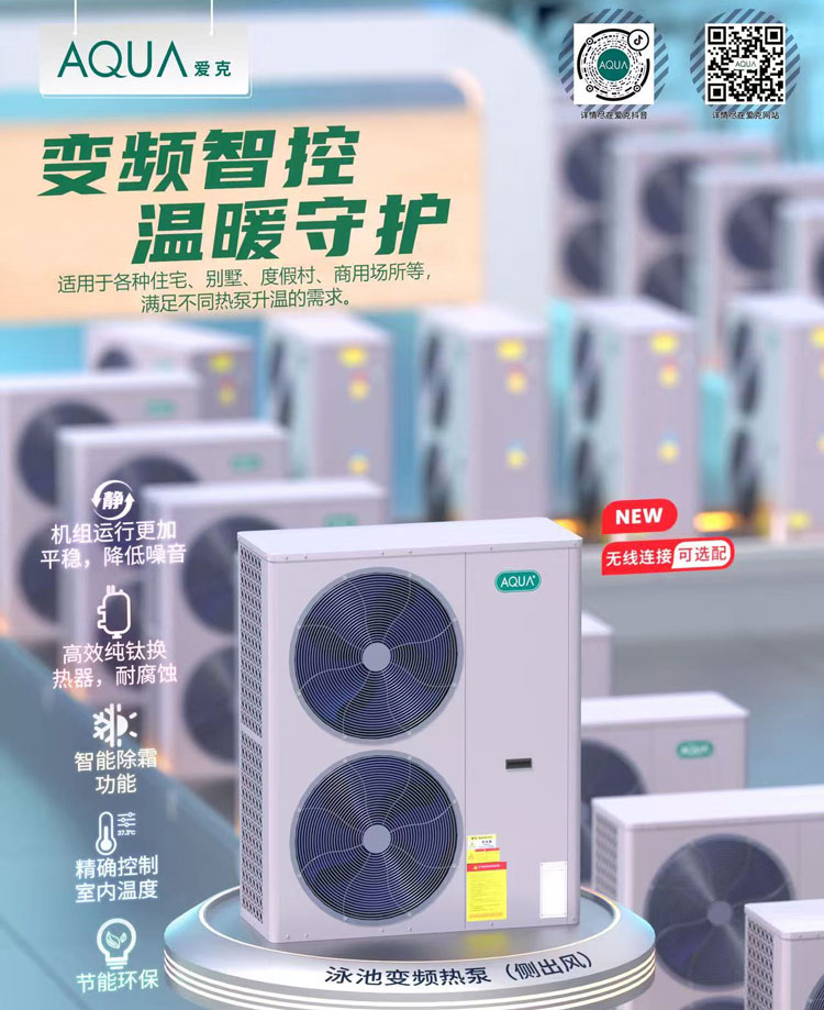 在消毒环节,AQUA爱克中压紫外线杀菌器通过200-400nm多波段紫外线,同步破坏微生物DNA、细胞壁及核酸,对细菌、隐孢子虫等病原体灭活率达99.99%;恒温除湿系统则通过空气源热泵与三集一体除湿热泵的协同工作,将水温稳定在27±1℃、室温控制在27-30℃、湿度维持在50%-75%的舒适区间,即便在-25℃的低温环境下仍能稳定运行。