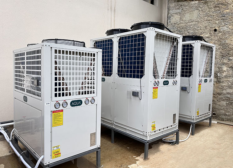 贵州全年相对湿度较高,室内泳池极易出现墙面结露、空气黏腻的问题,既影响宾客体验,又会加速设备老化。针对这一地域核心痛点,广州千叶特别配置了恒温除湿设备——打造空气源泳池恒温热泵与三集一体除湿热泵的组合方案。